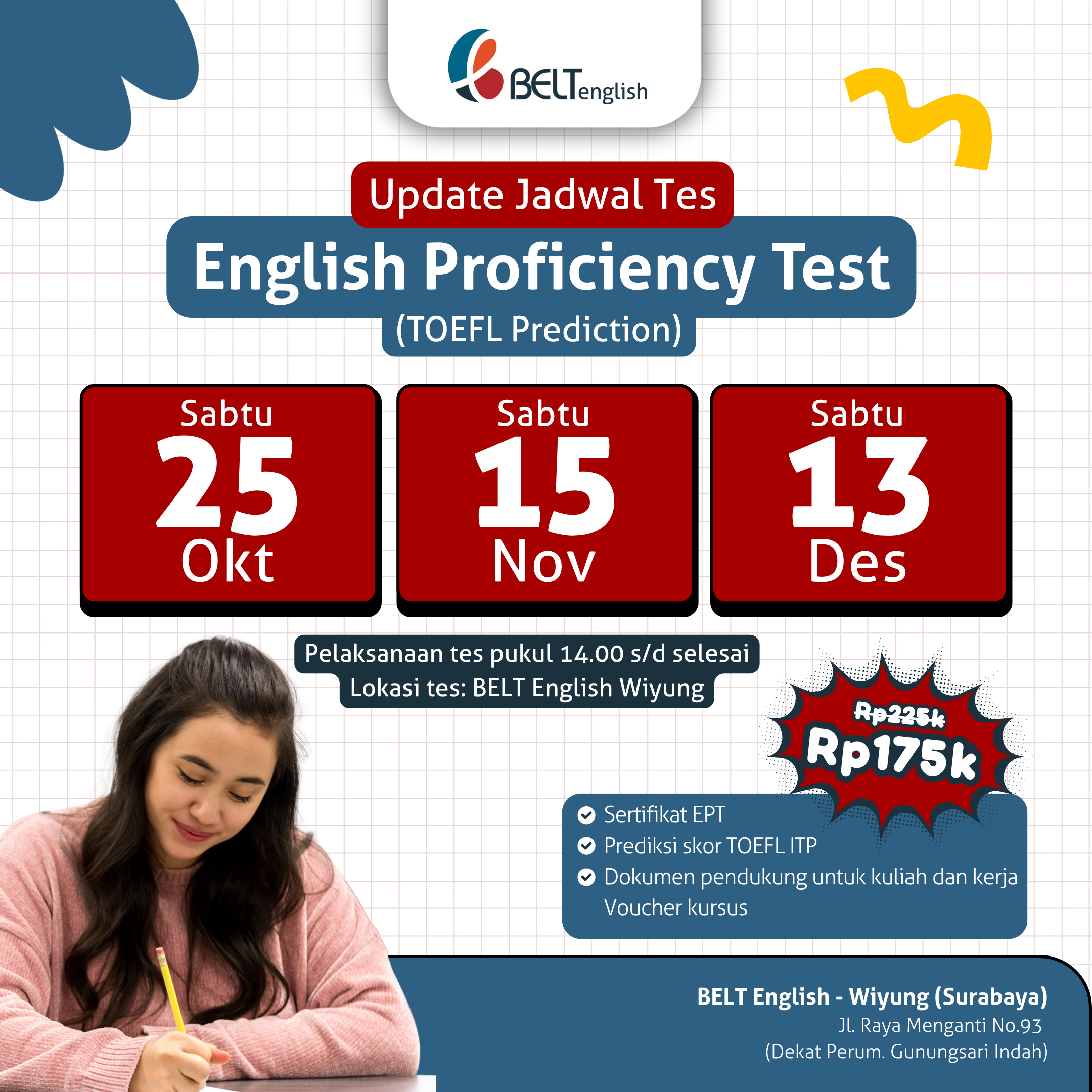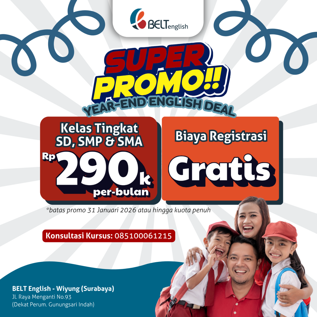 BELT English merupakan pusat kursus Bahasa Inggris yang telah berpengalaman kebih dari 15 tahun dalam mendidik siswa dari berbagai tingkatan, mulai dari SD, SMP, SMA serta Mahasiswa dan Profesional. Kami memiliki komitmen dalam memberikan pengalaman belajar yang efektif dan menyenangkan bagi setiap siswa kami.